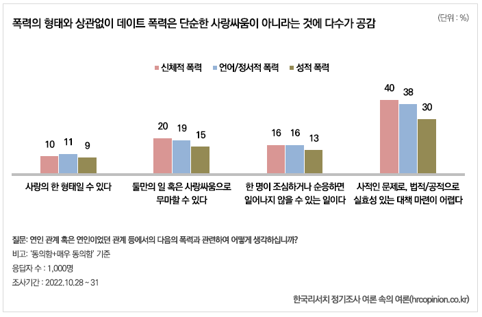 그리고 이러한 데이트 폭력에 대해서도 단순한 ‘사랑싸움’, ‘피해자가 잘못해서 벌어진 일’ 로만 바라보지는 않고 있다. 하지만 동시에, 신체적 폭력이나 언어·정서적 폭력에 대해서는 적지 않은 사람(10명 중 4명)이 실효성 있는 대책 마련이 어렵다는 우려를 표하고 있다.