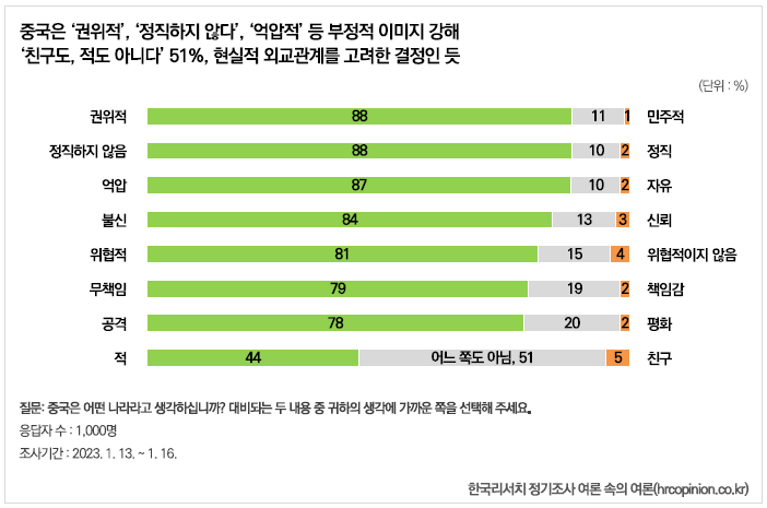 우리 국민 10명 중 8명 이상이 중국이 ‘권위적이고(88%, 민주적 1%)’, ‘정직하지 않으며(88%, 정직 2%)’ ‘억압적인(87%, 자유 2%)’, ‘불신(84%, 신뢰 3%)’, ‘위협적(81%, 위협적이지 않음 4%)’ 이미지에 가깝다고 응답했다.  그밖에도 ‘무책임(79%, 책임감 2%)’, ‘공격(78%, 평화 2%)’과 같은 부정적 이미지에 대다수가 공감하는 것으로 나타났다.