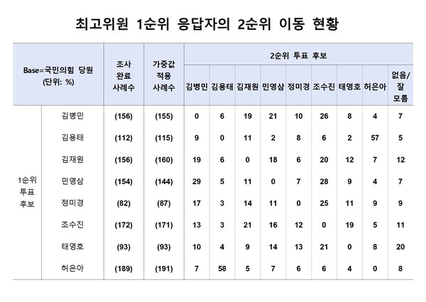 선두권의 조수진 후보 1순위 투표자의 경우 2순위 투표에서는 김재원 21%, 태영호 19%, 민영삼 16% 등으로 분산돼서 이동하는 모습을 보였다. 김병민 후보 1순위 투표자는 2순위로 조수진(26%), 민영삼(21%), 김재원(19%) 등의 순으로, 김재원 후보 1순위 투표자는 조수진(20%), 김병민(19%), 민영삼(18%) 드의 순으로 옮겨갔다.